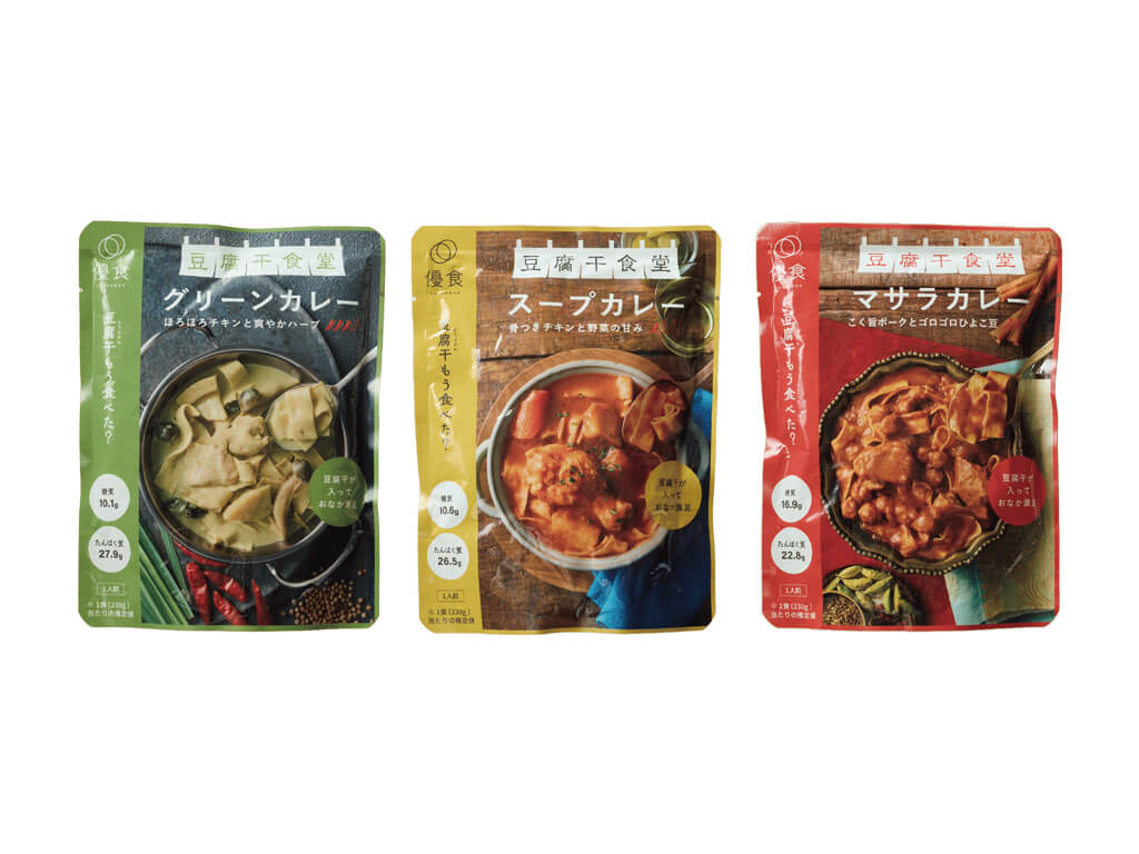 グルテンフリー食材〝豆腐干〟と一緒に食べる本格カレー。「豆腐干食堂 レトルトカレー3種類」5袋セットを3社に