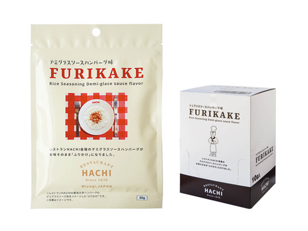 洋食レストランHACHIからふりかけが登場。 1979年の創業から愛されるデミグラスソースハンバーグの味を忠実に再現。豊かなコクと甘みが特長で、ご飯にかけるだけで懐かしい味わいが楽しめます。そのおいしさに米農家さんが喜んだというエピソードも。お土産にもおすすめ! 10袋セット(3,200円相当)を3オフィスに。